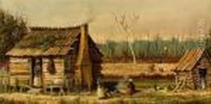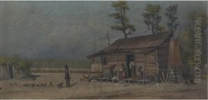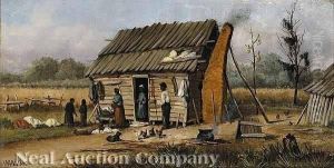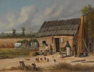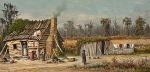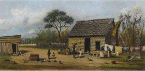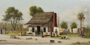Southern Cabin Scene With Family Surrounded By Chickens And Laundry Hanging On A Wood Fence