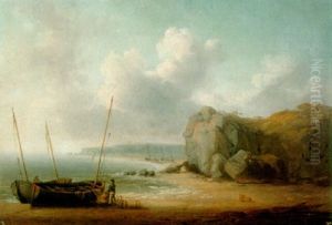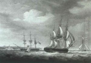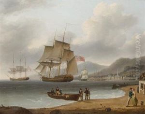 Frigates At Anchor, With A Ship's Cutter On The Shore