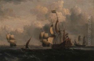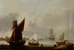 Dutch Barges And Men Of War Off The Coast In Calm Waters