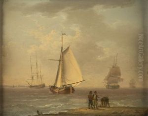 Frigates At Anchor, With A Ship's Cutter On The Shore