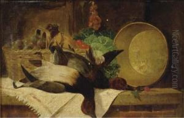 Still Life With Ducks, A Basket Of Fruit And A Pot On A Ledge