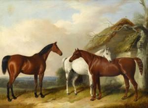 A Bay, A Chestnut And A Grey By A Thatched Cottage Oil Painting by William Barraud