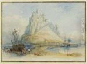 Fisherfolk, Beached Boat And Horses On The Shore, A Cliff Top Castle Beyond