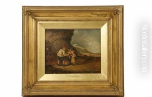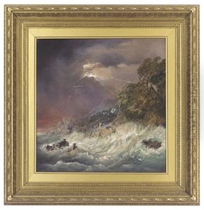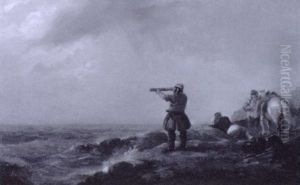 Seascape With Waves In Headland And Figures Gathering Kindling For Camp On Shore