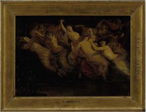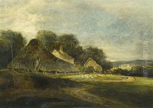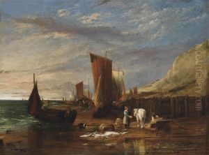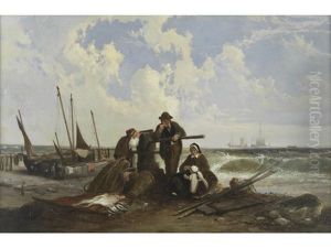 Figures On The Shore, Wth Laden Rowing Boats And Distant Sailing Vessels