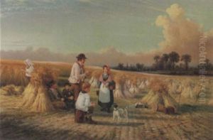 Familie Bei Der Nachlese Auf Einem Weizenfeld Vor Englischer Landschaft Mit Kirchdorf