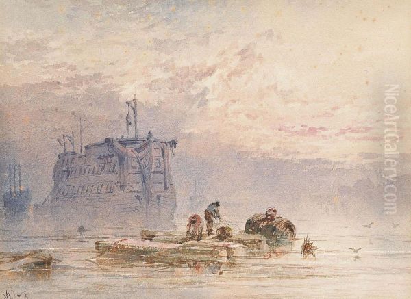A Breezy Day With Fisherfolk On The Foreshore; And Hulks At Anchor, Sunset