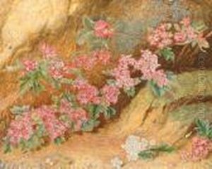 Still Life Of Flowers And A Fallen Goldfinch On A Mossy Bank.