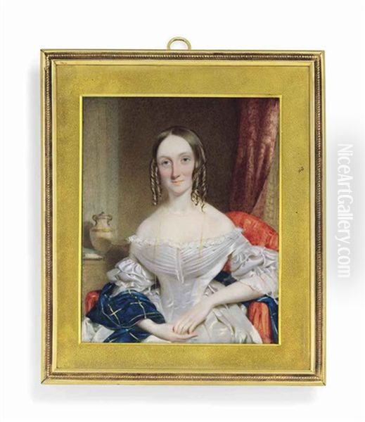 A Young Lady, In White Silk Dress With Lace Sleeves And Tartan Shawl, Thin Gold Necklace, Her Centre-parted Hair In Ringlets; Red Curtain