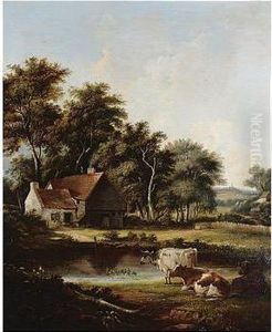 Cattle Watering By A River With Woodland