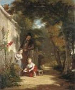 Village Scene With Figures Outside A Cottage With A Dog
