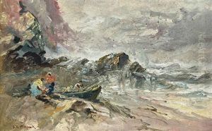 Coastal Scene With Moored Fishing Boats And Fisherfolk On The Shore