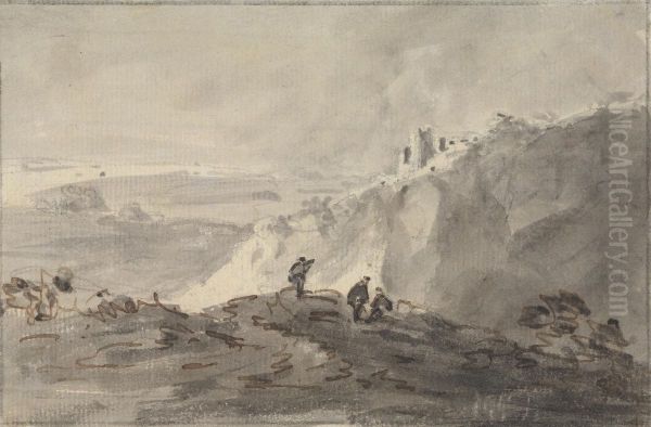Three Figures in a Hilly Landscape with Ruins, beyond