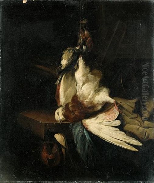 A Hanging Pigeon, A Finch And A Swallow