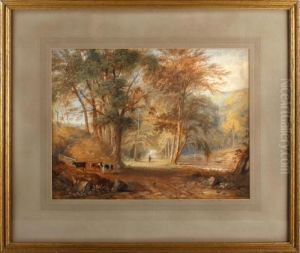 A Wooded Mountainous Landscape, With Shepherds And Their Flock By A Lake
