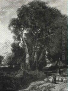 Shepherd With His Flock On A Path In A Wooded Landscape