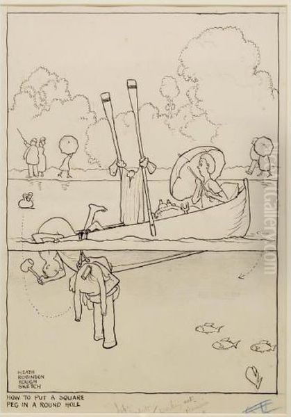 How To Put A Square Peg In A Round Hole Oil Painting - William Heath Robinson