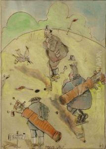 "pogo Golf" - A Humorous Scene Watercolour Wash With Pen And Ink