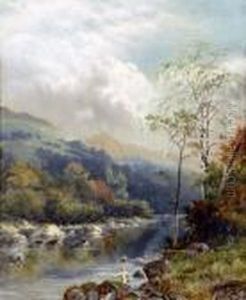 Mountainous River Landscape With Figures Fishing From A Rock In The Foreground