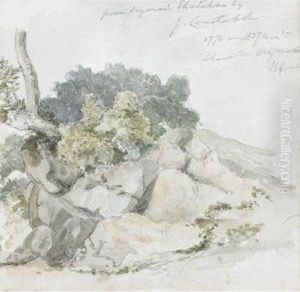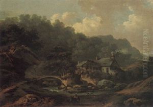 A Hilly Indian Landscape With Figures Passing By A Cave