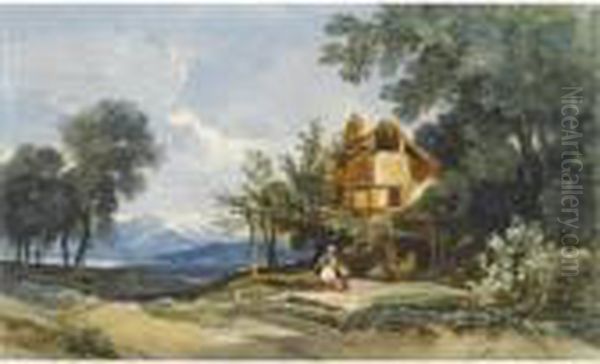 Two Women Before A Cottage, A Lake And Mountains Beyond