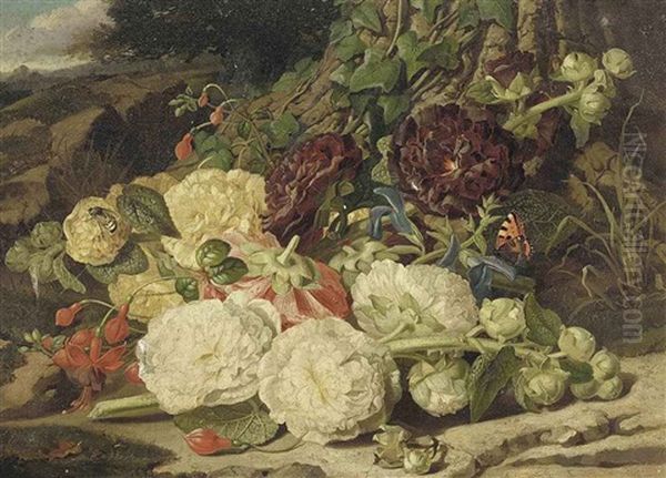 Peonies, Fuschias And Ivy On A Sandy Bank