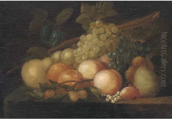 Grapes, Peaches, Plums, Pomegranates, Pears And Redcurrants, On A Ledge (+ Peaches, Plums, Grapes, A Melon, A Lemon, And Cherries, On A Ledge; Pair)