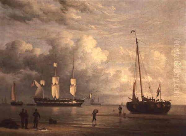 A Beach Scene With A Man O' War Off The Coast And Figures Loading A Barge In The Foreground