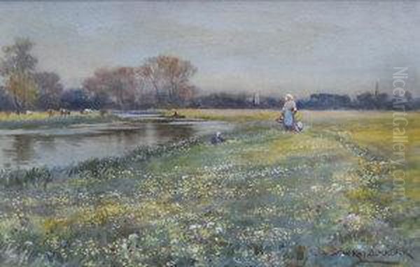 Figures Gathering Flowers On The Banks Of The River, In A Dutch Landscape