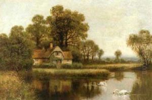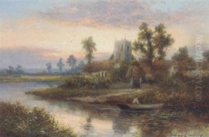 Englische Flusslandschaft Mit Cottage Und Fischer In Seinem Kahn. Kirchdorf Im Hintergrund