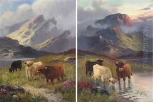 Highland Loch Scenes With Longhorn Cattle (a Pair)