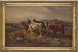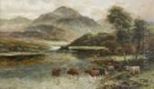 Cattle Watering In A Highland Riverlandscape Oil On Canvas Signed Lower Left 39.5cm X 60cm