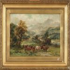 Cattle Watering Ina Highland River Landscape