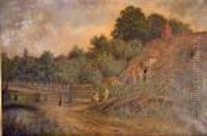 A Village Scene At Sunset With Lake In The Foreground And Parishchurch