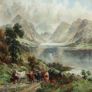 ````at Tarbert Loch Lomond' Highland Landscape With Mounted Drover Cattle And Farmstead, Signed Oil On Canvas