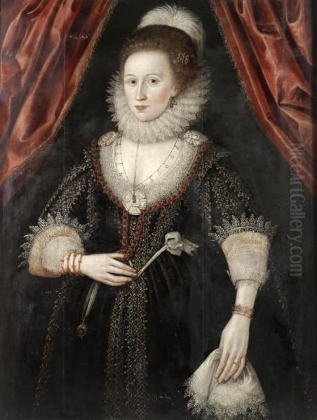 Portrait Of A Lady, Three-quarter-length, In A Black Embroidered Dress, White Lace Collar And Cuffs And Coral Jewellery, Standing Before A Red Curtain