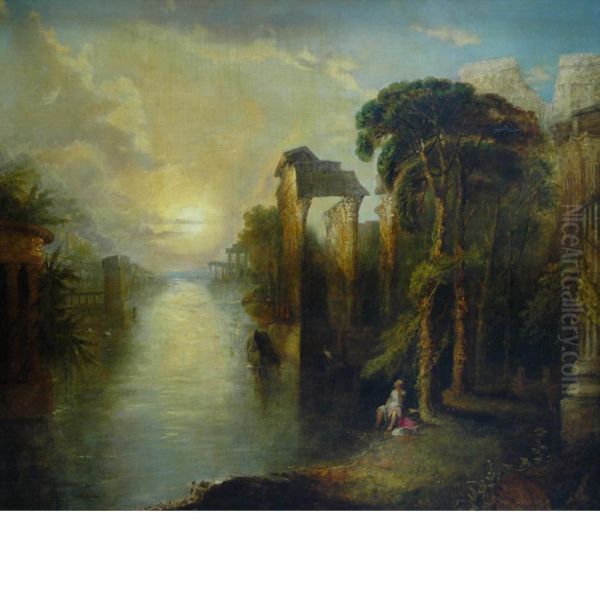Figure In A River Landscapewith Classical Ruins