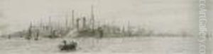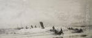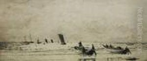 A View Of The Thames Estuary With Fishermen And Their Nets In A Dinghy In The Foreground