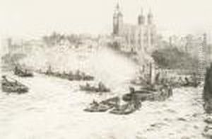 An Ironclad Under Tow On The Thames With Boats Standing By