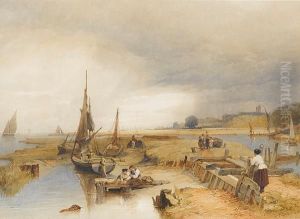 A View Of The Thames Estuary With Fishermen And Their Nets In A Dinghy In The Foreground
