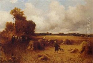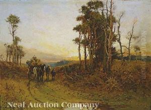 Autumn Scene, With A Farmer On A Shirehorse On A Country Path Alongside A Woman And Her Child