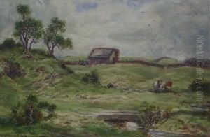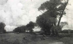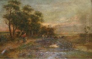 River Landscape At Dusk With Figures In A Punt And Cattle Watering At The Riverside