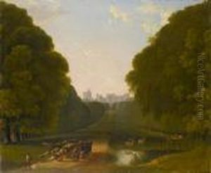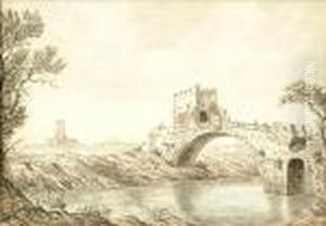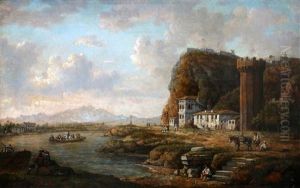 A River Landscape With A Ferry, Other Figures And A Donkey On The Bank, A Tower Beyond