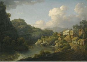 A Mountainous River Landscape With Boys Fishing