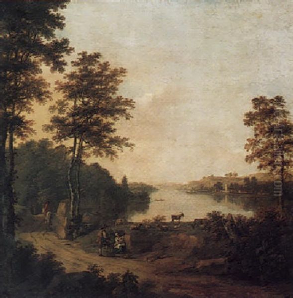 River Landscape With Figures And Animals On A Path, And A Distant Village