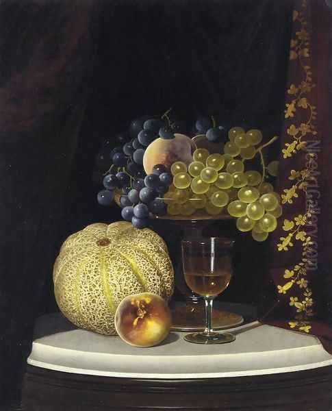 Still Life with Melon, Peach, Fruit-Filled Compote and Glass of Wine on a Marble Table Top