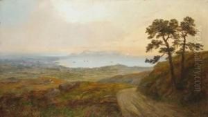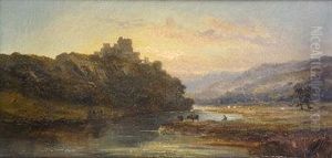 A River Scene With Cattle Grazing And A Castle Beyond At Sunset; An Upland River Scene With Mountains Beyond