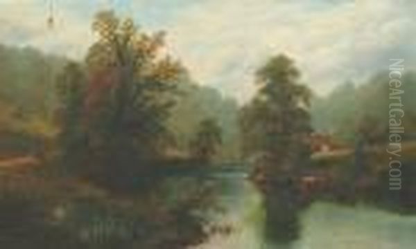 Cattle Watering With A Figure On A Woodland Track, Possibly A Stretch On The River Wharfe
