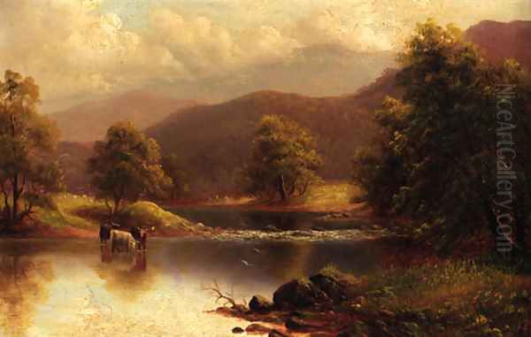 Cattle watering in a tranquil river landscape