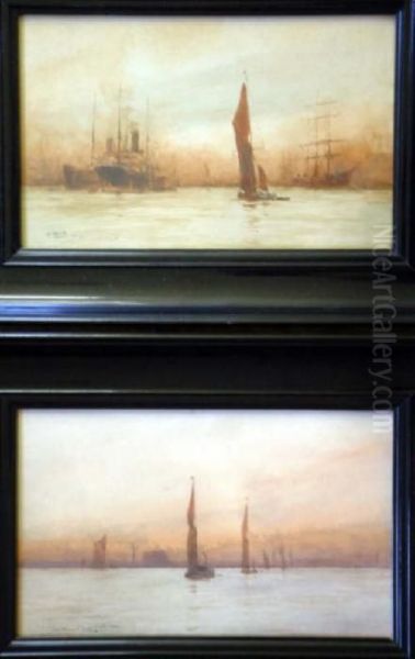 Pair Of Watercolours 'off Rotherhithe' & 'out With Wind And Tide, Off Limehouse' Signed And Dated 1915 6.5 X 10.75in